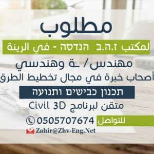لمكتب ז.ה.ב הנדסה في قرية الرينة - مطلوب مهندس/ ــة في مجال تخطيط الطرق والشوارع