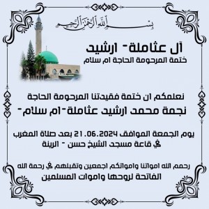 ختمة المرحوم الحاجة ام سلام عثاملة غداً الجمعة بعد صلاة المغرب في قاعة مسجد الشيخ حسن