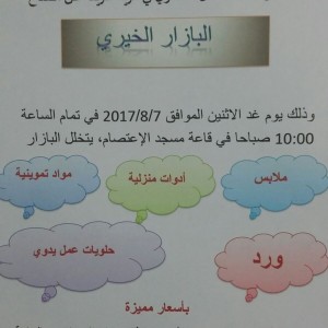 نساء العمل الدعوي في قرية الرينة يدعونكم اليوم لافتتاح البازار الخيري في مسجد الاعتصام