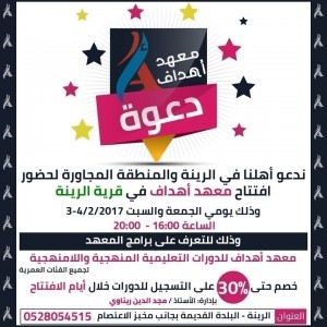 دعوة لحضور افتتاح معهد أهداف في الرينة، خصم 30% على التسجيل للدورات خلال أيام الافتتاح