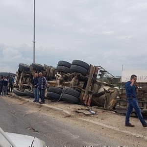 اصابة متوسطة لسائق اثر انقلاب خلاط باطون على شارع 79 صفورية وازدحامات مرورية خانقة