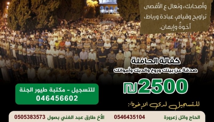 مشروع بر الوالدين: اغتنم بركة وأجر 50 مُصلي ولمن يرغب في كفالة حافلة لأداء صلاة التراويح في المسجد الأقصى المبارك بنية صدقة جارية عن روح والديه أو بنية الفرج والتوفيق والبركة التوجه للأخوة الأفاضل: