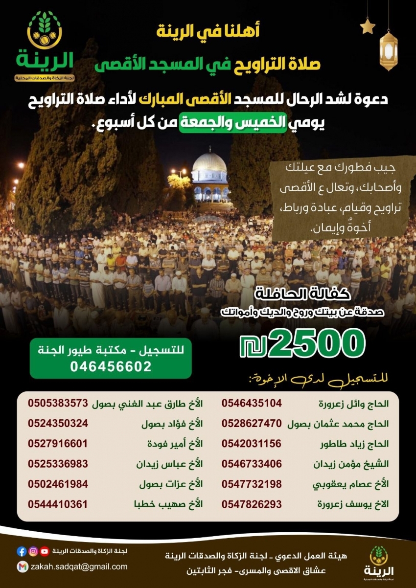 ونحن نعيش نفحات شهر رمضان الفضيل ندعوكم أهالي قريتنا الرينة الكرام للسفر وشد الرحال إلى المسجد الأقصى المبارك لأداء صلاة التراويح في المسجد الأقصى المبارك رجالاً ونساءً شيباً وشباناً.