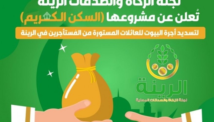 استمراراً لعطاءها الطيب المبارك وتواصُلاً بالخير مع ابناء قريتنا والنظر في احوالهم ومؤازرتهم والوقوف الى جانبهم ، تستمر لجنة الزكاة والصدقات في قرية الرينة في مسيرتها المباركة من خيرٍ إلى خير، حيث رصدت لجنة الزكاة والصدقات للعام السادس على التوالي برصد سهماً من أموال الزكاة والصدقات قيمته اكثر من 100 الف شيكل كسهمٍ لتسديد أُجرة البيوت للعائلات المستورة المُتعففة في بلدنا من المستأجرين ذوي الأوضاع الاقتصادية الصعبة والأسر الكبيرة.