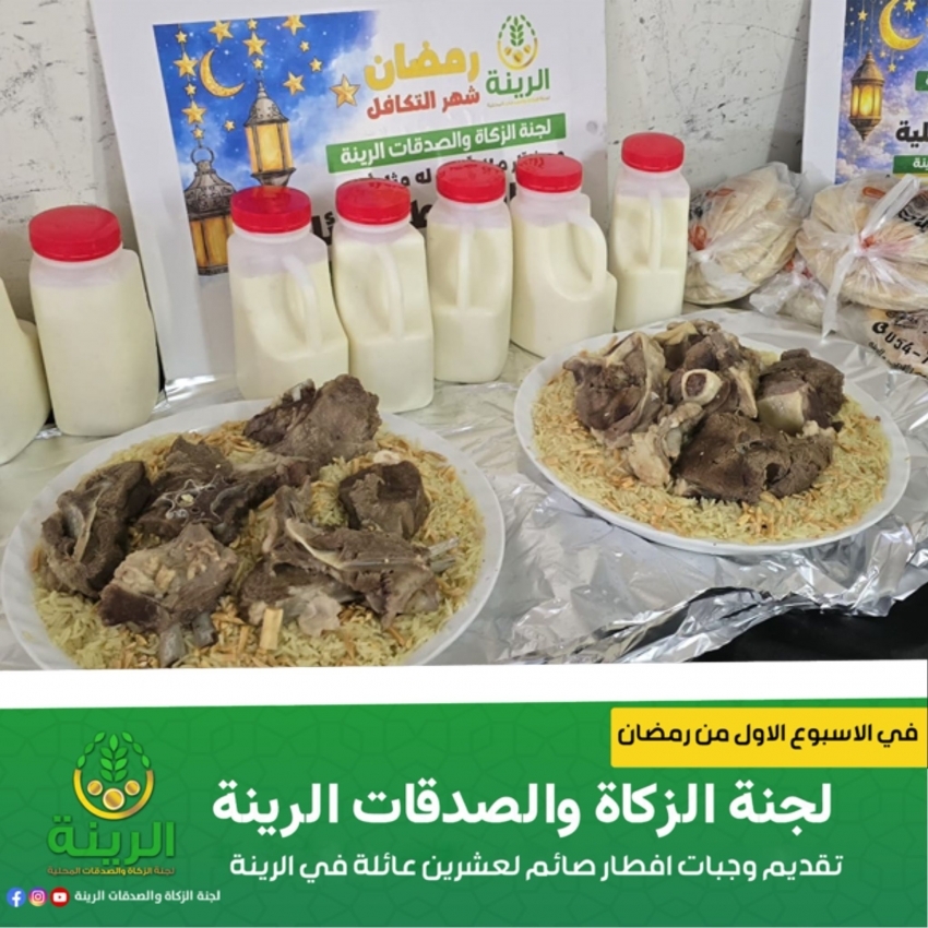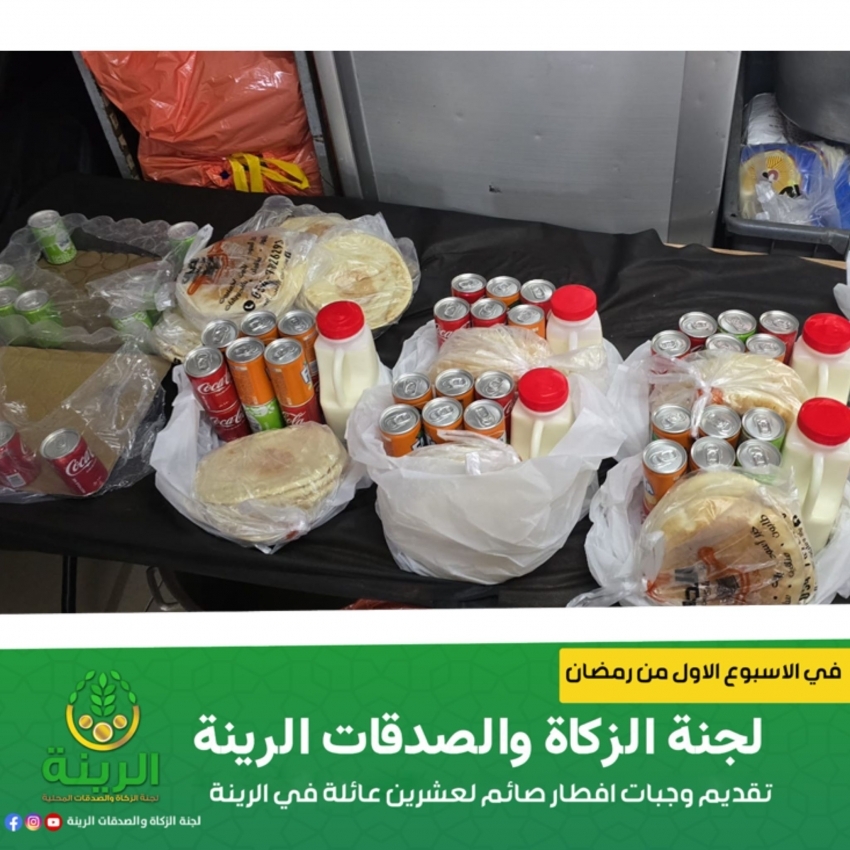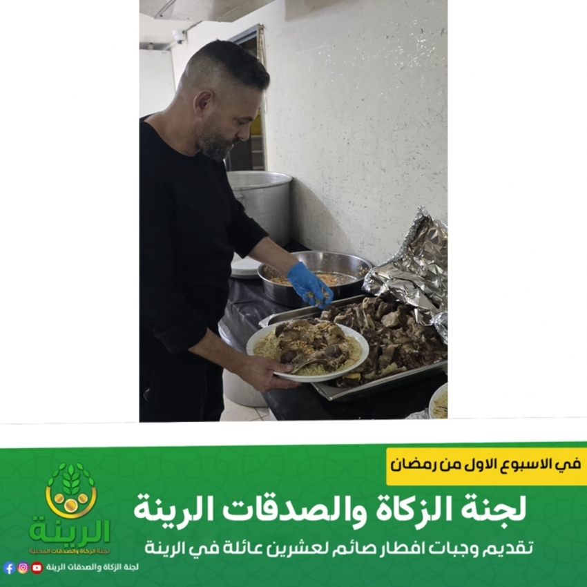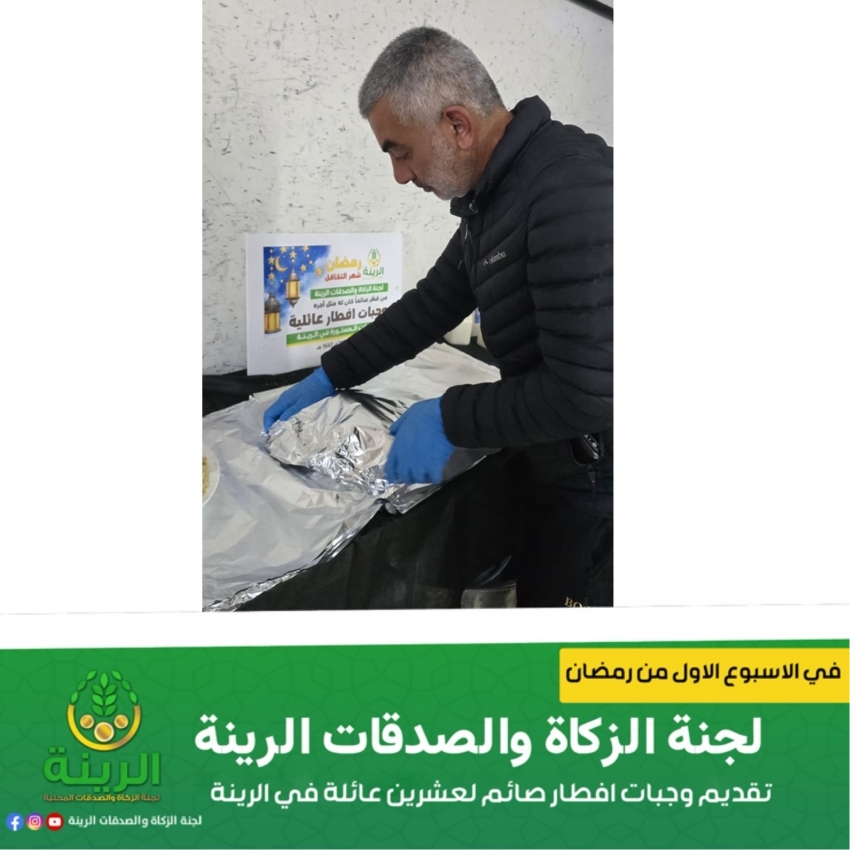استمراراً لمسيرة الخير والعطاء التي تخطو بها لجنة الزكاة والصدقات في قرية الرينة طيلة ايام السنة تواصُلاً مع العائلات المتعففة المستورة في البلدة، وفي نفحات شهر الخير والبركة شهر التراحم والتكافل وقوفاً الى جانب ابناء قريتنا تأديةً للواجب الديني والانساني الاغاثي ومسيرة الخير بحق أهلنا ، قامت لجنة الزكاة والصدقات في الرينة بتفطير اكثر من 100 صائم من العائلات المتعففة في قرية الرينة في الاسبوع الاول من الشهر الفضيل، حيث تم تجهيز وجبات عائلية تضمنت الرز واللحم مع اللبن وايصالها للبيوت المتعففة عملاً بتعاليم ديننا الحنيف ورسالة نبينا صل الله عليه وسلم باطعام الطعام، وتحصيل الاجر والثواب لقوله صل الله عليه وسلم : "من فطّر صائماً كان لها مثل أجره" وإحياءً ورباطاً وتوثيقاً لمبدأ التكافل والتراحُم وبث ثمار وبذور الخير وشرف الخدمة بحق أهلنا وديننا الحنيف.