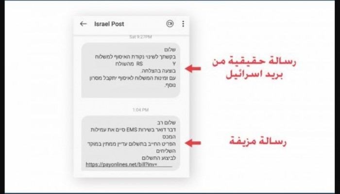في هذه الأيام، هناك محاولات واسعة النطاق من عمليات التصيد الاحتيالي عبر الرسائل النصية - انتحال شخصية بريد إسرائيل ، باستخدام الرسائل النصية (SMS) وذلك بهدف الحصول على معلومات ائتمانية وسرقة الأموال. ويرجى ملاحظة أنه كجزء من الهجوم ومحاولات الاحتيال، يستخدم المشتبه بهم الرقم والاسم الحقيقي لخدمات بريد إسرائيل، بحيث يتلقى الشخص الذي تلقى سابقًا رسائل أصلية وحقيقية من بريد إسرائيل رسالة التصيد الاحتيالي من نفس المرسل (Israel Post). الرسائل مرفق بها رابط خبيث يُطلب من الضحية إدخال معلوماته بطاقته الائتمانية على الموقع الإلكتروني الذي ينتحل شخصية بريد إسرائيل، لصالح دفع مزعوم لرسوم جمركية.