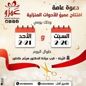 دعوة عامة لأهالي الرينة للمشاركة في افتتاح محل عمروُ للأدوات المنزلية