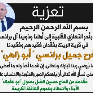 تعزية لآل برانسي بوفاة الفقيد فرح برانسي "ابو زاهي"- مقدمة من الحاج حسين فضل بصول ابو عفيف الابناء والاحفاد
