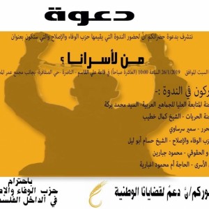 دعوة عامة: حزب الوفاء والإصلاح يُنظم ندوة بعنوان "من لأسرانا"في قاعة علي القاسم الرينة