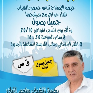جبهة الاصلاح في الرينة تدعوا جمهور الشباب للقاء حواري مع المرشح جميل بصول يوم غد السبت