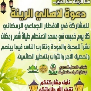 دعوة لاهالي الرينة للمشاركة في الافطار الجماعي كل يوم خميس في مسجد الاعتصام طيلة شهر رمضان