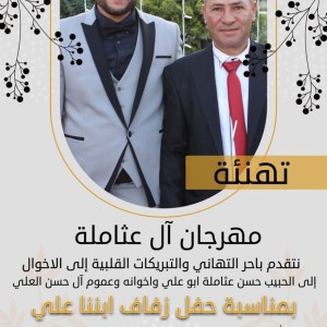 تهنئة للعريس علي حسن عثاملة وعموم آل عثاملة بمناسبة الزفاف- مقدمة من يوسف وكريم محمد عثاملة