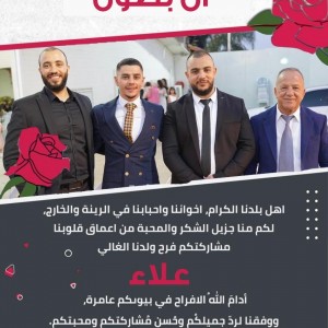رسالة شكر وتقدير من آل بصول في الرينة لكل من شاركهم فرحتهم بابنهم الغالي علاء
