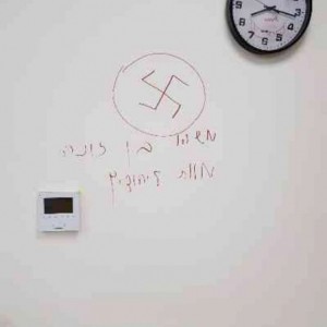 رسم شعار الصليب المعكوف على جدار احدى الروضات بيافا