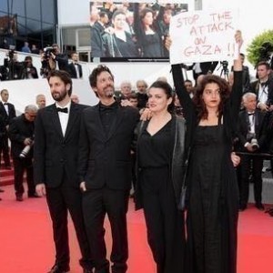 ممثلة لبنانية ترفع لافتة أوقفوا العدوان على غزة في مهرجان "كان" السينمائي