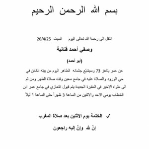آل بصول : ختمة المرحوم الشاب احمد سلام احمد بصول غداً السبت بعد صلاة المغرب في قاعة مسجد الشيخ قاسم